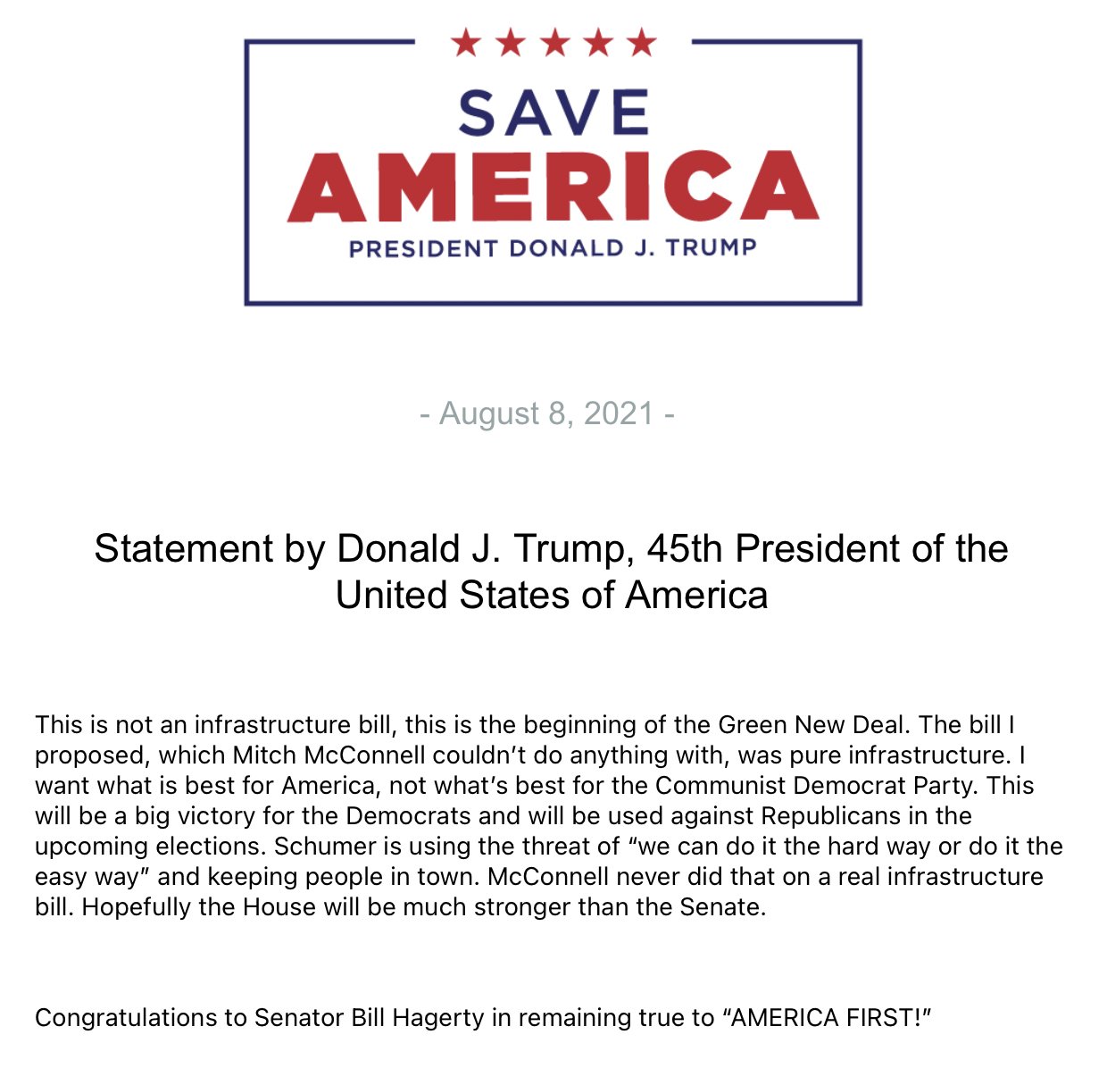 【これはインフラス投資法案ではなく、グリーンニューディールの始まりです。私が提案した法案は、ミッチ・マコーネルは何もできませんでしたが、純粋なインフラストラクチャーでした。 私は共産党にとりベストなものではなく、アメリカにとりベストなものが欲しいのです。 これは民主党にとって大きな勝利であり、次の選挙で共和党に対して使用されます。シューマーは「私たちはそれを激しい方法で行うことも、楽な方法で行うこともできる」という脅しを利用して、人々を町に留めています。マコーネルは、実際のインフラストラクチャーの法案でそれを行ったことはありません。 下院が上院よりもはるかに強いことを願います。