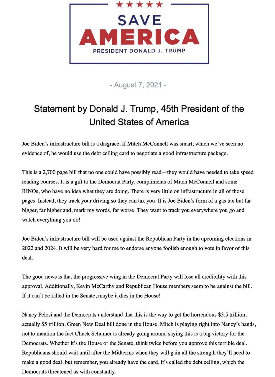 これは2,700ページの法案であり、誰も読むことができないものでした。速読コースを受講する必要があったでしょう。それは民主党への贈り物であり、ミッチ・マコーネルと何人かの自分がなにをしているのかわからないRINOからの賛辞です。これらすべてのページみはインフラストラクチャについてのことはほとんどありません。代わりに、彼らはあなたに課税できるようにあなたの運転を追跡します。ジョー・バイデンのガソリン税の形式は、はるかに大きく、はるかに高く、私の言葉を記せば、はるかに悪いです。彼らはあなたがどこへ行ってもあなたを追跡し、あなたがすることすべてを見たいと思っています!