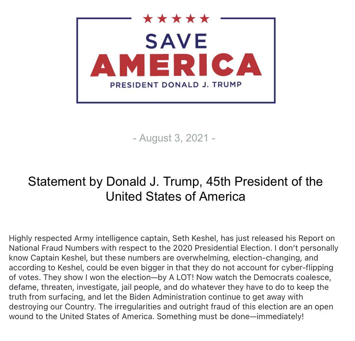 【たいへん尊敬されている軍諜報機関のキャプテンであるセス・ケシェルは、2020年の大統領選挙に関する全国の不正の件数に関するレポートを発表しました。 個人的にはケシェル大尉を知りませんが、これらの数字は圧倒的で選挙を変えるものであり、ケシェルによれば、これはサイバー投票による反転を考慮しておらず、さらに大きくなる可能性があります。 それらは私が選挙に勝ったことを示しています — 大幅に! 今、民主党員が、癒着し、名誉を毀損し、脅迫し、調査し、刑務所に入れ、真実が表面化するのを防ぐために彼らがしなければならないことを何でもし、バイデン政権が私たちの国を破壊するのを逃がし続けるのを見てください。 この選挙の不規則性と完全な詐欺は、アメリカ合衆国の開いた傷口です。 何かをしなければなりません — すぐに! 】