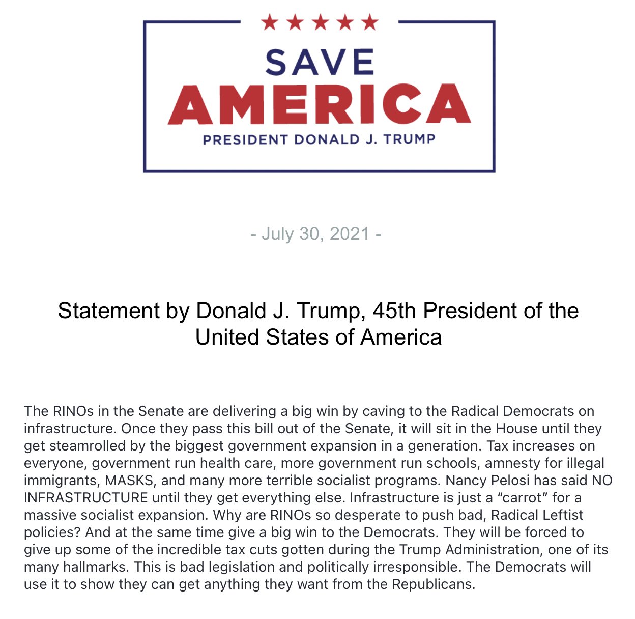 【上院のRINOは、インフラ投資法案について過激な民主党員に屈服することで大きな勝利を収めています。 彼らがこの法案を上院から通過させると、この世代で最大の政府の拡大によって勢いを増すまで、それは下院にとどまります。 すべての人への増税、政府が運営する医療、政府が運営する学校の増加、不法移民に対する恩赦、マスク、その他多くの酷い社会主義プログラム。 ナンシーペロシは、すべてを手に入れるまでインフラ投資法案はないと言っています。 インフラ投資法案は、大規模な社会主義拡大のための単なる「ニンジン」です。 なぜRINOは、悪い過激な左派政策を推し進めようと必死になっているのでしょうか。 そして同時に、民主党に大きな勝利をもたらしています。 彼らは、トランプ政権の多くの特徴の1つである信じられないほどの減税のいくつかをあきらめることを余儀なくされるでしょう。 これは悪い法律であり、政治的に無責任です。 民主党はそれを使用して、共和党から欲しいものを何でも手に入れることができることを示します。 】400兆円規模の財政支出は増税もさることながらインフレを引き起こすと懸念されており、日本人の私たちにも決して他人事ではありません。