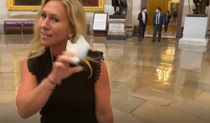 まず、状況設定。国会議事堂内は暫くマスク着用しなくてよかったようですが、下院では義務化するというので今週、すったもんだしていました。共和党下院議員たちは猛抗議を表明し、一時みなで上院側のフロアへ大移動。そして再び下院フロアに戻って来る時にMTグリーン議員が、さも真剣に「ここからCOVIDの世界よ」と演技するのが冒頭部。その際に「マスクホール体験よ」と言いますが、これは何か。