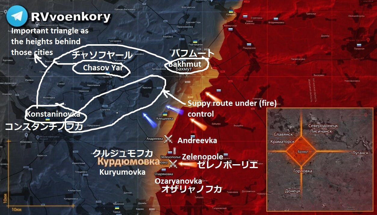 「暫定データによると、ロシア軍は事実上、ウクライナ軍の補給ルート(チャソフヤールへの高速道路とオザリャノフカ〜クルジュモフカ〜ゼレノポーリエのライン)を支配しています。この三角形は、バフムート、チャソフヤール、コンスタンチノフカの補給基地として戦略的に重要です。重要なのは、チャソフヤールへのウクライナ軍供給ルートの制御です。現在、そこは(ロシア)連合軍部隊の*管理下にあります」とセミョン・ペゴフは書いています。