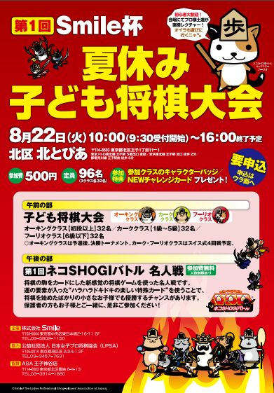 夏休み子ども将棋大会をLPSAさんよりご案内いただいています。第1回Smile杯。東京都北区ですね。JR王子駅降りてすぐの北とぴあ。8月22日で火曜日平日なのですが、お父さんかお母さんが都合つけばぜひ参加してみてください。「ネコSHOGIバトル」今後流行るでしょうから(笑)覚えて来るといいかもしれません。