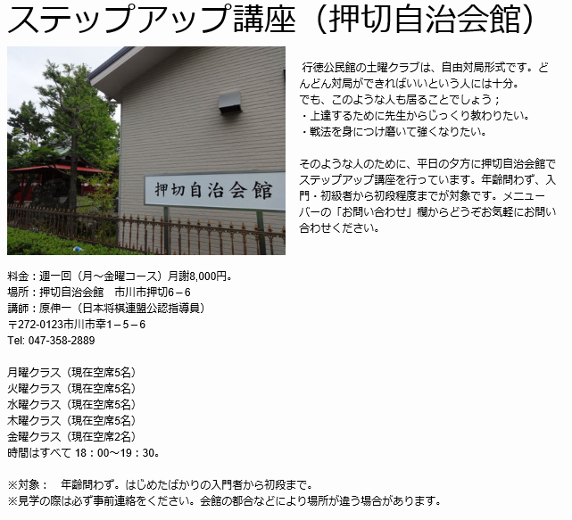 案内は以下固定サイトにて。フォークシンガー原のサイト内。「先生、恥ずかしいからやめてください」と言われそうな支離滅裂なページですが、あきらめてください。行徳の子供将棋はフォークシンガーがやってます;