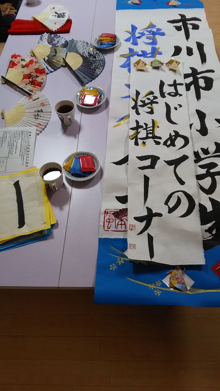 と怪し気な入りですが、スパイ活動ではありません。妙典祭りで将棋ブースに素晴らしい飾りつけをしてくれました工作班の親子のみなさんに、アート書道家の矢野華風先生の書道教室に集まっていただきました。教室のみなさんに制作いただいた各種表記や作品を観て、当日の飾りつけをイメージしてもらうため。