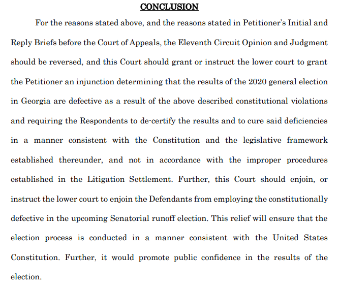 結論: 上記理由により、そして原告の控訴前の裁判や回答書に述べられた理由により、第11巡回裁判所の判決は覆されるべきである。そしてこの裁判所は次のことを認め、下級裁判所に認めるよう指示すべきである。ジョージアの2020年選挙が上記に述べられた憲法違反により欠陥があることを決定し差し止め措置を原告に認めること。被告に結果承認を取り下げさせ、訴訟措置を要するような不適切な方式でなく憲法と法的に確立された制度に沿った形に修復させること。さらにこの裁判所は、来たるべき上院議員決選投票において被告に憲法違反をさせないようにし、また下級裁判所にもそうさせぬよう指示すべきである。この救済措置は選挙プロセスが合衆国憲法に沿った形で行われることを保障する。そしてそれは、選挙結果への国民の自信を高める。
