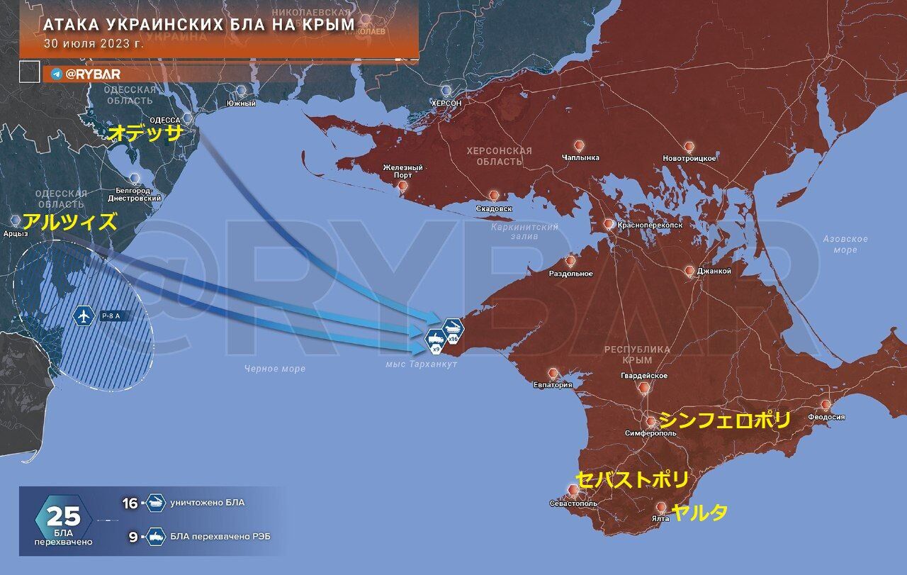 これまでの攻撃とは異なり、ウクライナ軍はドローン「ムギン」をタルカンクート岬の方面へのみ飛ばしたが、そこでクリミア防衛軍によって破壊され、墜落しました。16機が防空網で撃墜され、9機が電子戦で制圧されました。