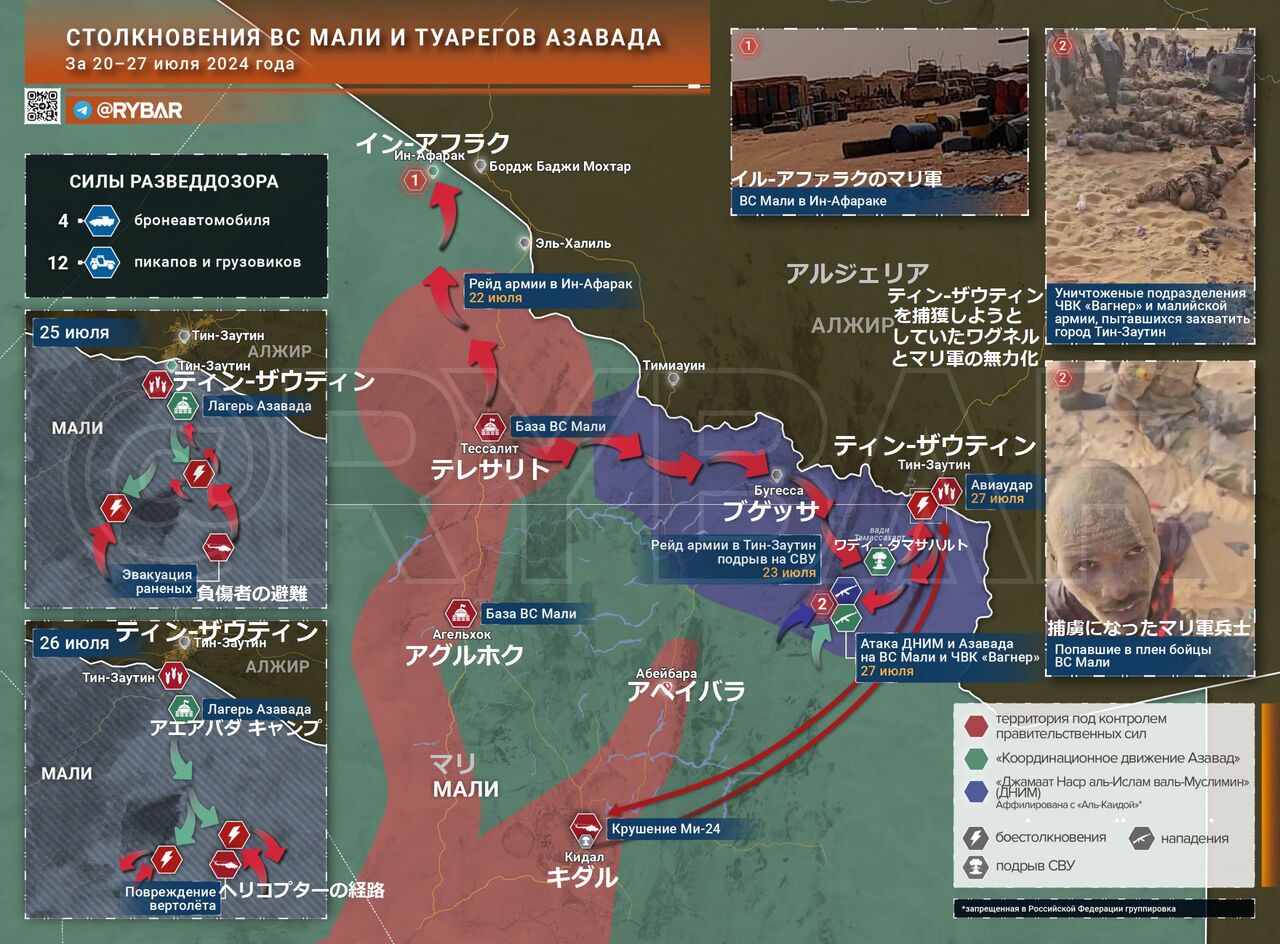 ・7月27日、政府軍は市郊外から撤退を開始した(トゥアレグ族は予備兵力の集結を続けた)。同時に、アルカイダのマリ支部の過激派が行動を開始した。明らかにアザワド運動と連携して行動しているジャマアト・ナスル・アル・イスラム・ワル・ムスリム集団が、マリ国軍とワグネルの車列を待ち伏せした。ティン山脈近くのガミラで、地雷を仕掛けていた。