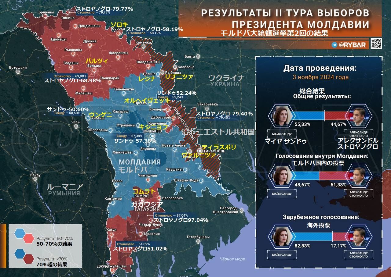 ▼モルドバ国内では、キシナウ(57.38%)、オルヘイヴェッキ(52.24%)、ウンゲニ(50.60%)の3大都市でサンドゥが勝利した。欧州統合に関する国民投票の場合と同様、現大統領は外国離散者の投票結果が82.83%を獲得したことで救われた。