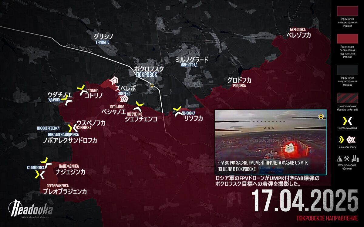Readovka編集チームは、特別軍事作戦における4月17日の最も重要な出来事を収集した。ロシア軍はポクロフスク近郊で主導権を握り、攻撃を再開した。ウクライナでは、ロシア航空宇宙軍が爆撃に使用している改良型UMPK(汎用滑空修正モジュール)システムが、ウクライナの電子戦システムの影響を受けなくなったことが確認された。