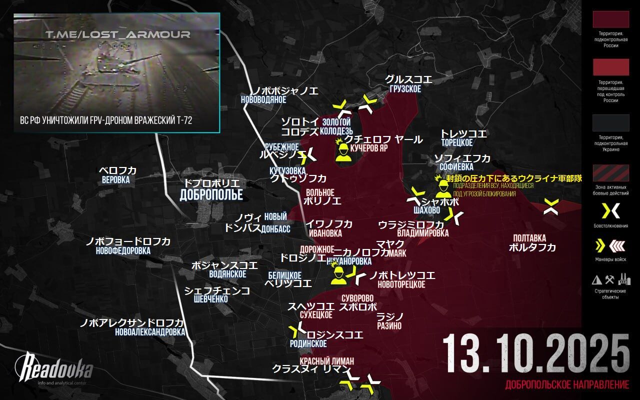 【ロシア軍はウラジミロフカを奪還し、黄金の井戸への窓を切断した。10月13日付けのReadovka最終報告】