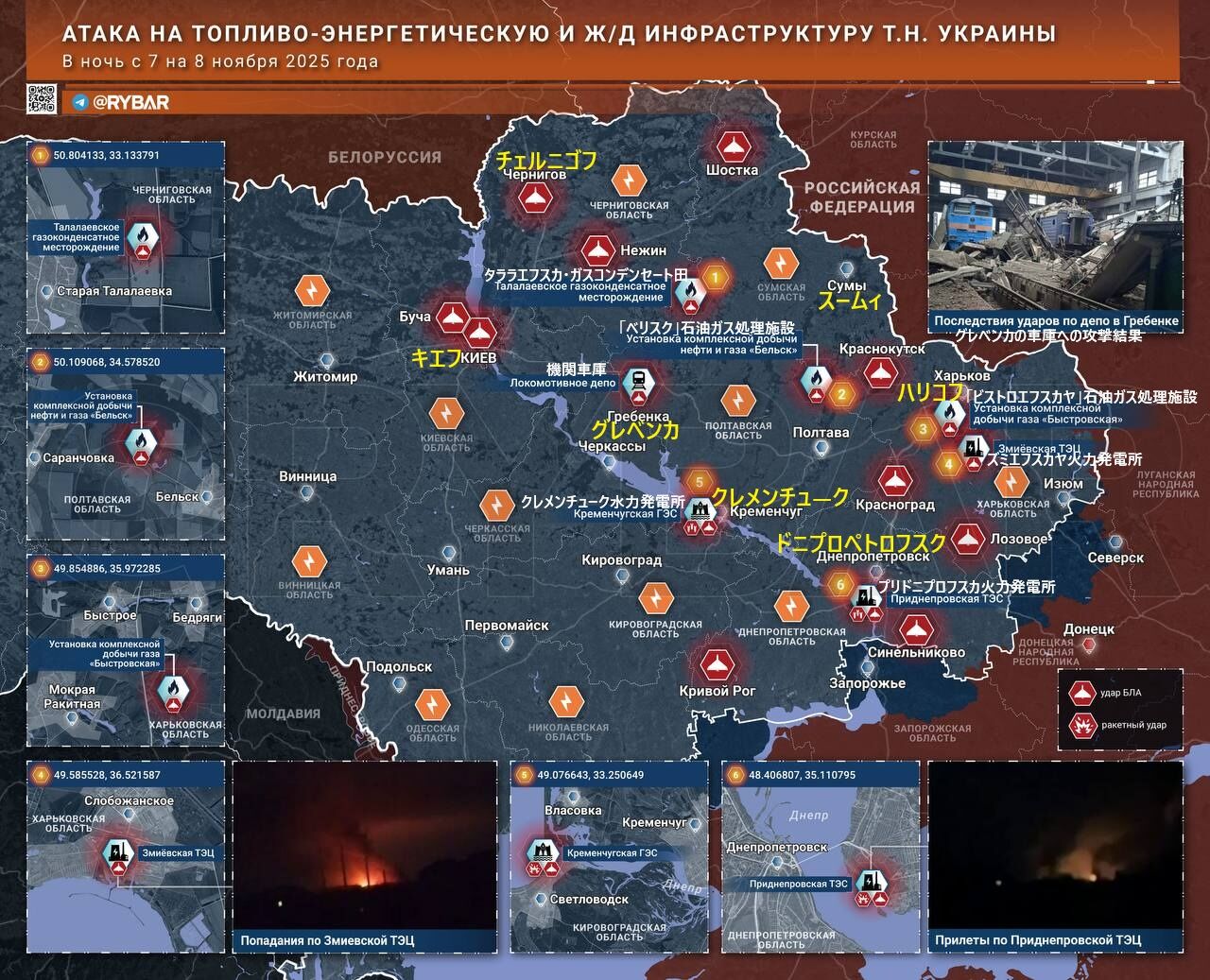 ※ロシア軍が敵の重要性の高い発電・輸送拠点に集中攻撃を行っていることも注目に値する。 11月8日夜、ウクライナの国営企業とされるセントレネルゴは、国内のすべての火力発電所の停止を発表した。