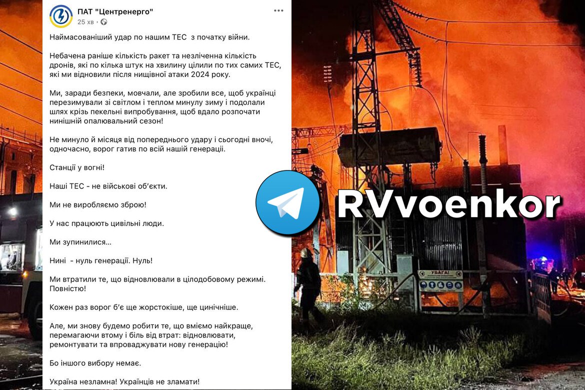 「発電ゼロ、発電所火災」:ツェントルエネルゴ社の声明によると、ウクライナにある同社の火力発電所はすべて、一夜にして攻撃を受け、停止した。