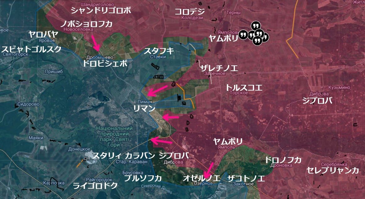 2 – リマン方面。ロシア軍は、リマン、オゼルノエ、ジブロバ、ドロビシェボといった複数の集落を巡って同時並行で戦闘を繰り広げている。