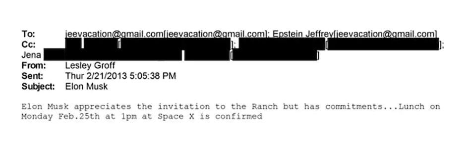 ・イーロン・マスクは2012年から2014年にかけてエプスタインと文通し、島への訪問や派手なパーティーについて尋ねていた。エプスタインのアシスタントからマスクに送られた手紙の1通には、「3人の娘全員のパスポートのコピーを送った」という文言が含まれている。マスク自身は島への訪問を頑なに否定している。