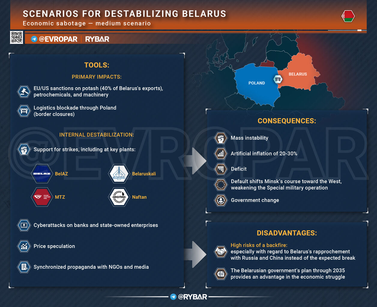 国の経済的不安定化というシナリオは別の問題である。このアプローチはベラルーシ国民に大きな負担をかける可能性がある。人々に深刻なストレスを与え、国家機関への信頼を損ない、国内犯罪の増加や社会の過激化につながる可能性がある。