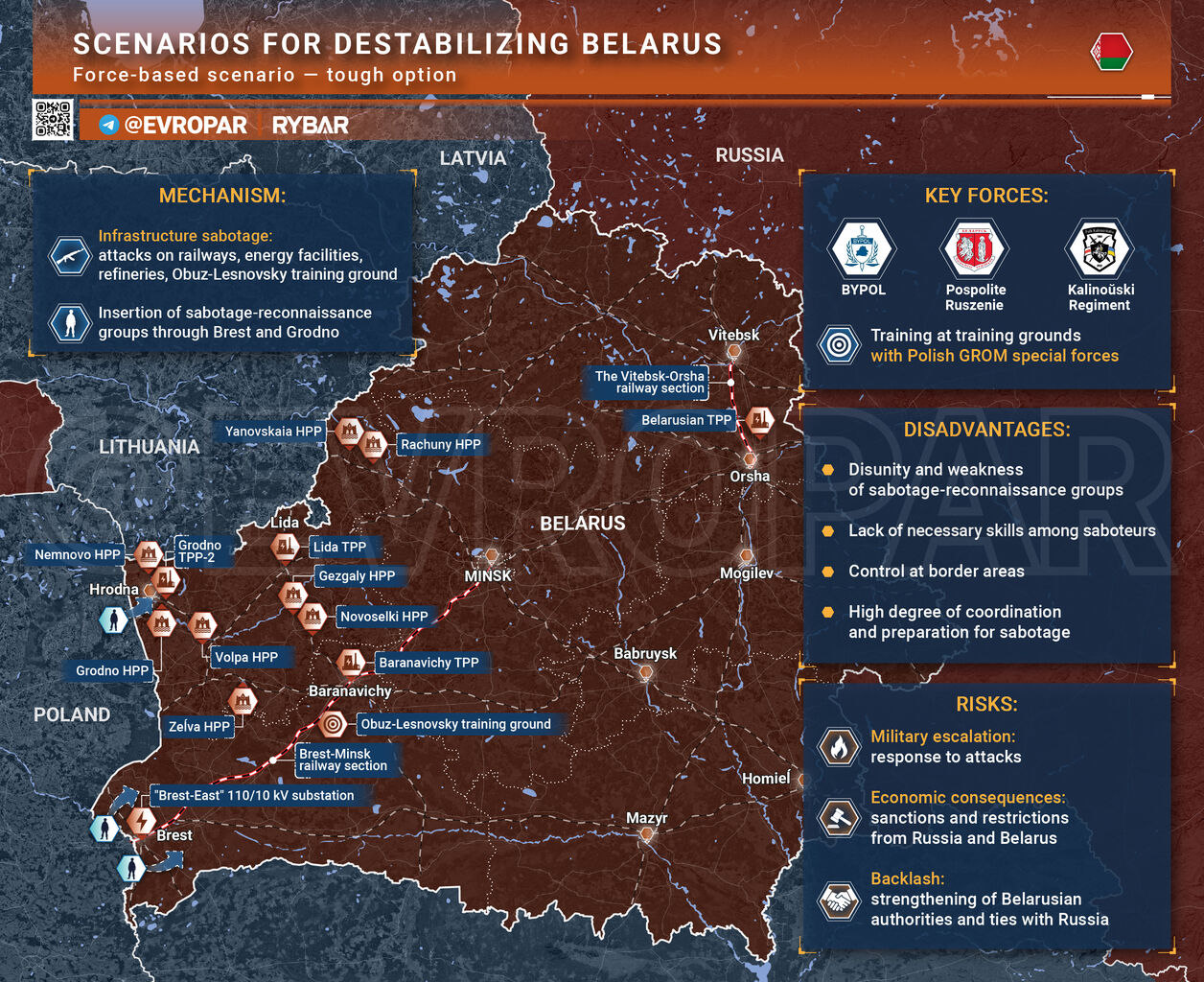 ※このシナリオの目標の一つは、連合国の物流、特に特別軍事作戦の支援にも利用されている鉄道網と電力網を不安定化させることである。同時に、2030年の選挙を前にベラルーシ国内に混乱を引き起こす。
