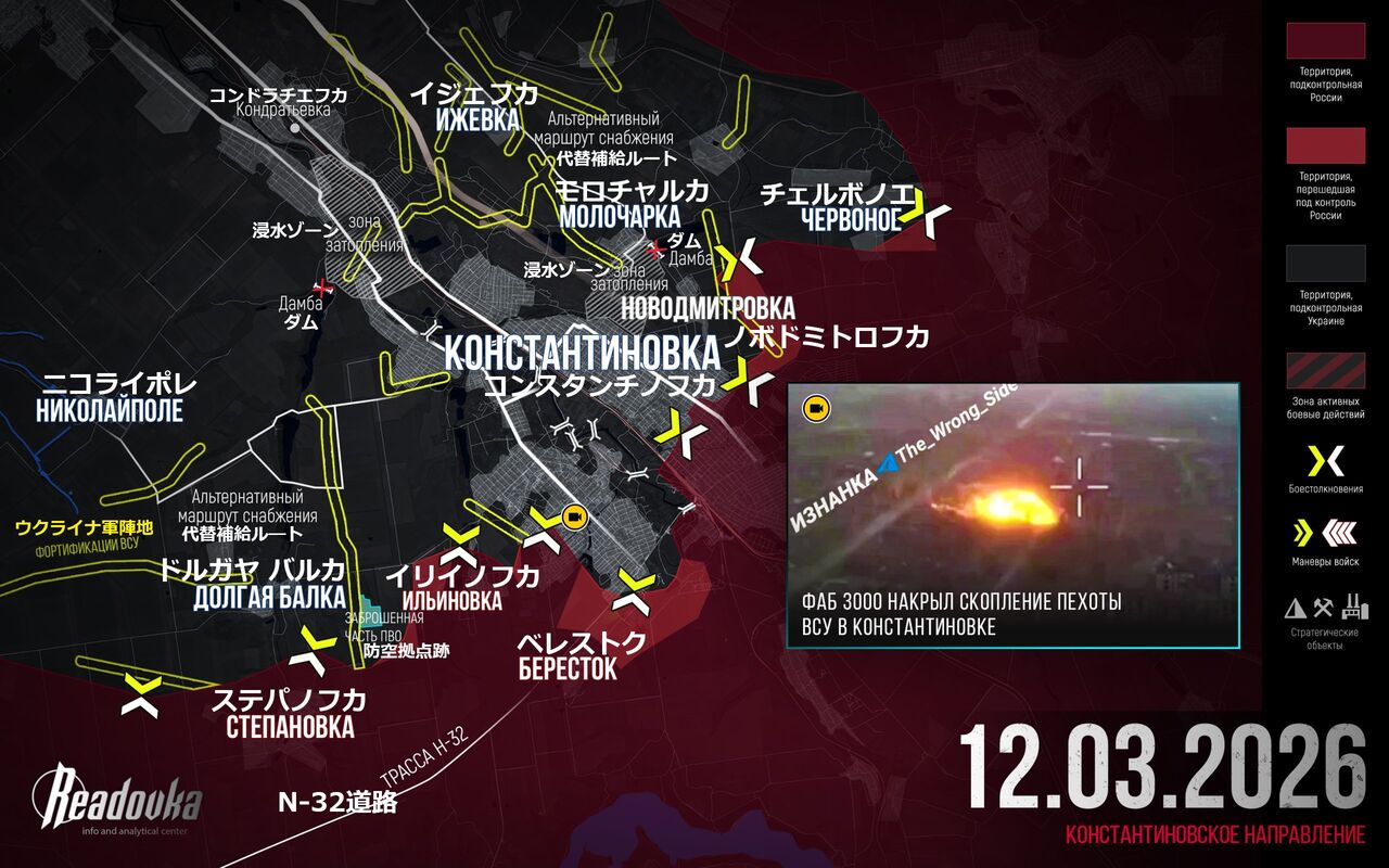 Readovka編集部は、特別軍事作戦において3月12日の最も重要な出来事を要約した。ロシア軍はコンスタンチノフカのウクライナ軍駐屯地の戦闘能力を継続的に弱体化させており、別の補給路も遮断された。SBU(ウクライナ保安庁)は、ウクライナ軍からの多数の脱走兵の過激化という問題を無視し、ロシアを「テロ国家」と描写することを目的とした情報作戦を実施したが、失敗に終わった。